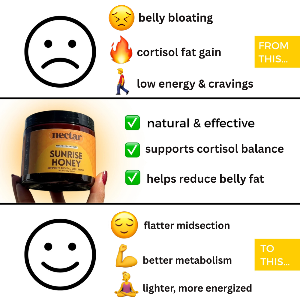 If stress makes you overeat or gain belly fat, Sunrise Honey helps calm cortisol so you can stay in control, reduce cravings, and support a healthier waistline.